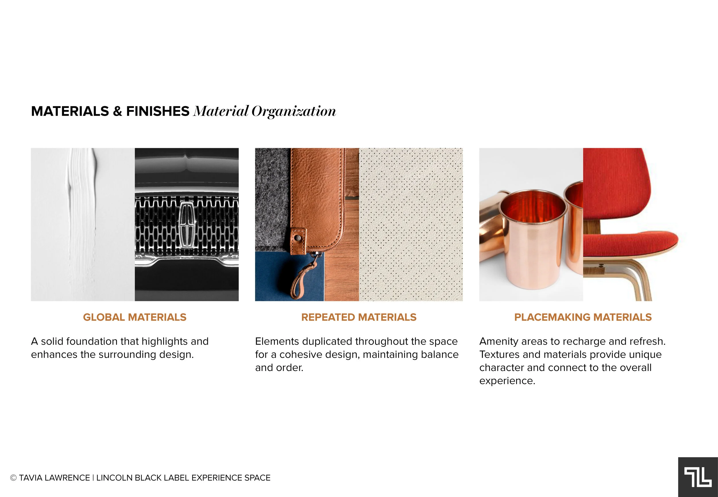 Inspired by the car theme’s interiors of Black Label, the design concept ALL IN THE DETAILS focuses on the place where the driver spends the most time. The interior space reflects a certain kinds of craftsmanship such as the significance of a seam, the warmth of premium leather and the delicate touch of a fine-quality fabric. The experience aims to introduce potential luxury clients to the Black Label brand. The program is reflective of a host of benefits that are included with the member privileges. The design plan allows guests to experience the ultimate in luxury, comfort and personal service, while highlighting all six premium designer themes. Each themes attributes are brought to life through experiential, aesthetic and culinary activations. Guests will be engaged with Lincoln through events, activities, food and culture.
